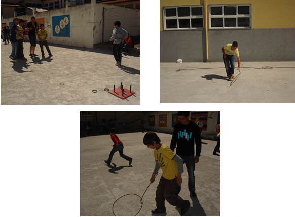 Os alunos deslocaram-se ao espaço onde decorriam os jogos tradicionais e, competindo entre si ou em comunhão com os alunos mais novos, tiveram oportunidade de experimentar alguns dos jogos que em tempos faziam parte das brincadeiras dos seus pais e avós.